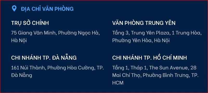 • • Trụ sở Hà Nội: Tầng 3 và 4, 75 Giang Văn Minh, Ba Đình, Hà Nội