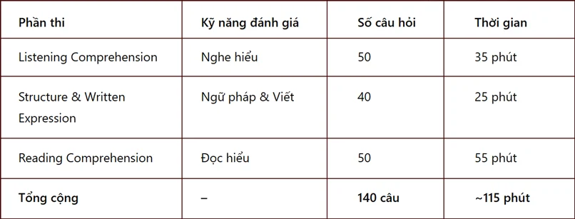 Bài thi TOEFL ITP (Institutional Testing Program) được thiết kế nhằm đánh giá toàn diện năng lực tiếng Anh học thuật của thí sinh, tập trung vào ba kỹ năng chính: Nghe – Ngữ pháp – Đọc hiểu.