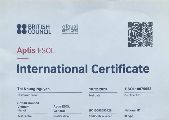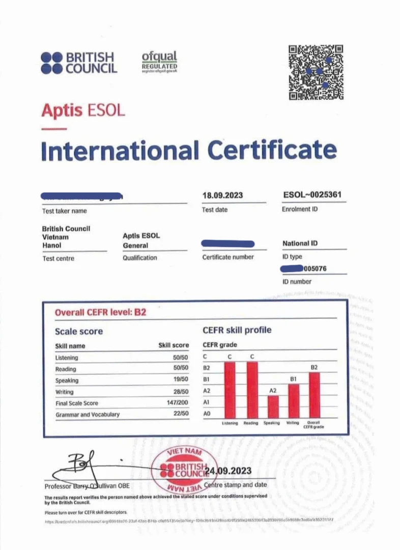 - – Tra cứu trực tuyến trên hệ thống xác thực của British Council quốc tế hoặc Aptistests.vn, đảm bảo minh bạch, nhanh chóng.