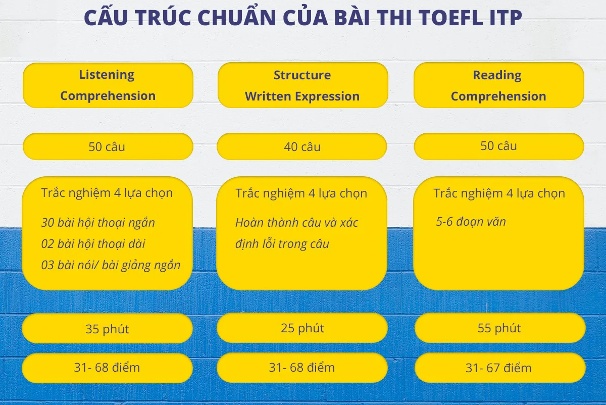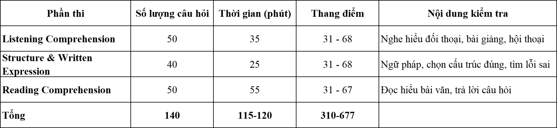 - Bài thi gồm 3 kỹ năng: Listening, Structure & Written Expression, Reading. Tổng thời gian 115-120 phút, 100% trắc nghiệm trên giấy.